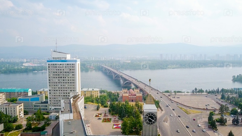 Городские часы. Коммунальный мост, администрация города. Панорама города Красноярска. Россия, Из Дрона