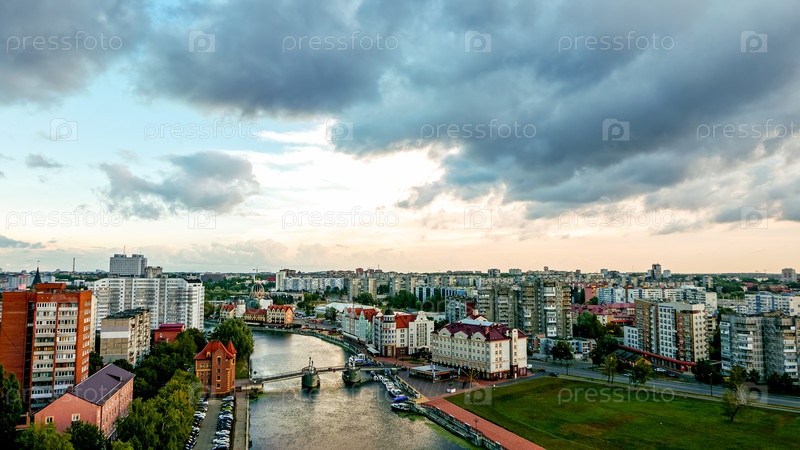 Пасмурная погода в Калининграде. Река Преголя, набережная Рыбной деревни и Юбилейный мост. Россия, Калининград
