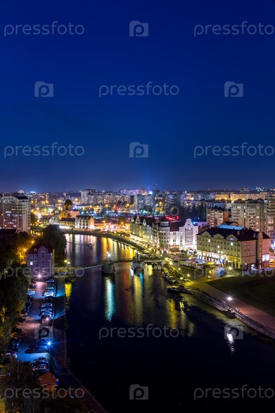 Ночной вид на центр Калининграда. Юбилейный мост, Рыбная деревня, Каналы реки Преголи. Россия