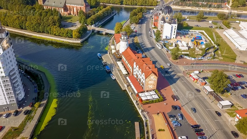 Вид с воздуха на центр Калининграда. Маяк в Рыбной деревне, Медовый мост. Россия