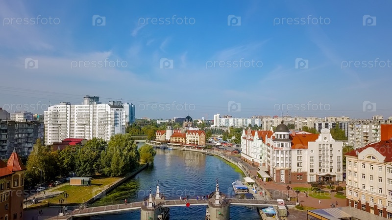 Вид с воздуха на центр Калининграда. Маяк в Рыбной деревне, Медовый мост. Россия