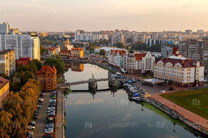 Утро в Калининграде. Река Преголя, набережная Рыбной деревни и Юбилейный мост. Россия, Калининград