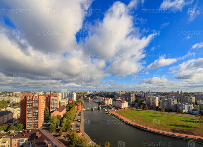 Пасмурная погода в Калининграде. Река Преголя, набережная Рыбной деревни и Юбилейный мост. Россия, Калининград