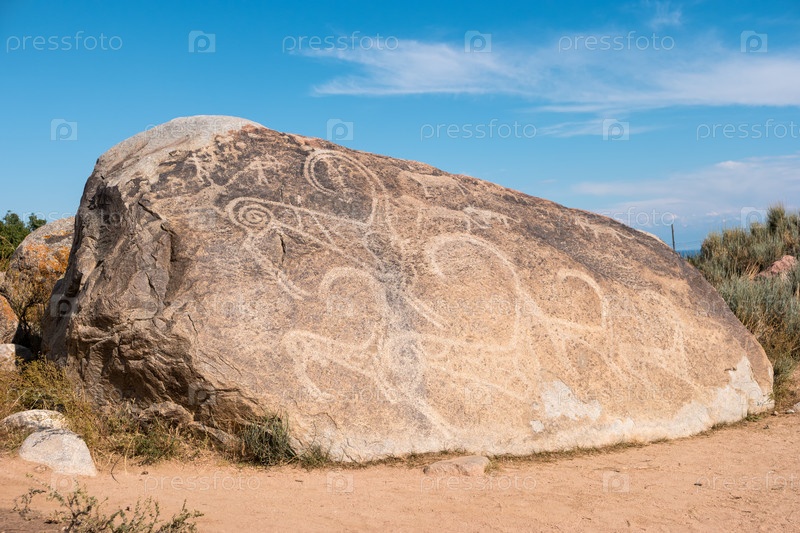 Древние рисунки, петроглифы на скалах у Иссык-Куля, Чолпон-Ата, Кыргызстан