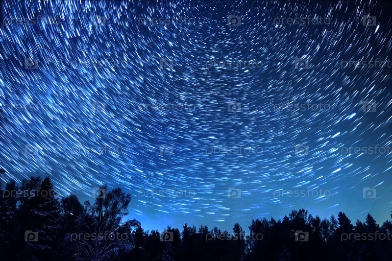 Звездное небо вращается вокруг полярной звезды. Оставляйте следы в виде линий. Зима, Россия