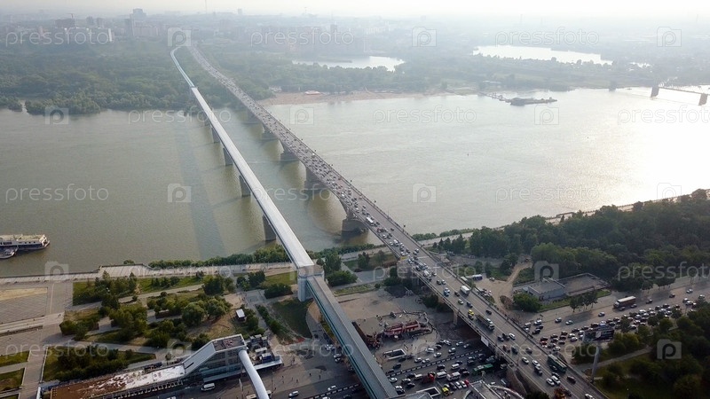 Метро-мост и Коммунальный мост. Панорама города Новосибирска. Вид на реку Обь. Россия, Из Дрона