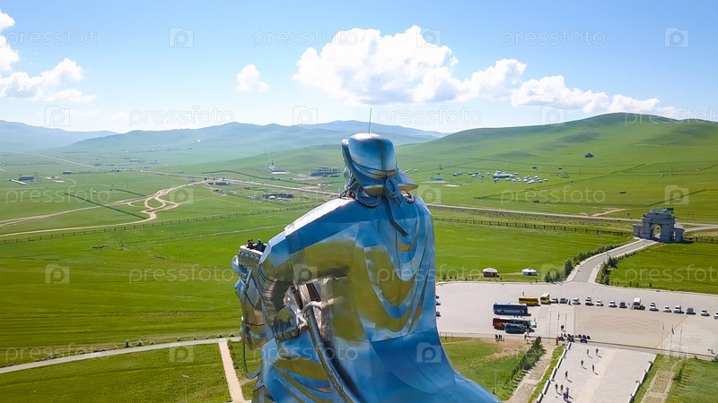 Конная статуя Чингисхана в солнечную погоду. Монголия, Улан-Батор, с дрона