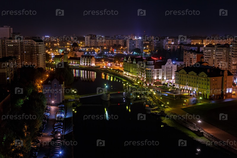 Ночь в Калининграде. Река Преголя, набережная Рыбной деревни и Юбилейный мост. Россия, Калининград