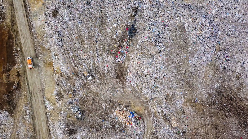 Трактор перевозит мусор на свалках в окрестностях города Екатеринбурга, Россия, с дрона, СНИМОК ГОЛОВЫ