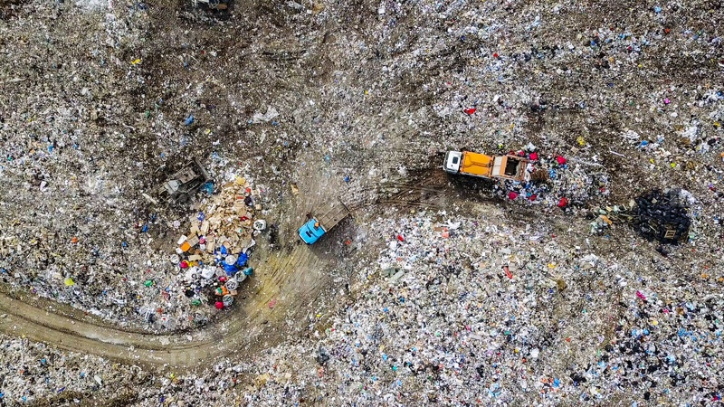 Мусоросборники выгружают мусор на свалку в окрестностях города Екатеринбург, Россия, с беспилотника, HEAD OVER SHOT