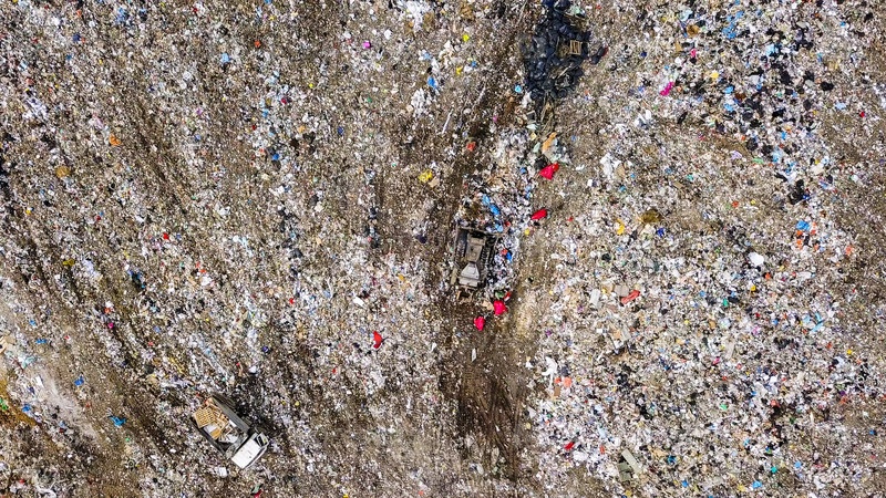 Трактор перевозит мусор на свалках в окрестностях города Екатеринбург, Россия, From Drone