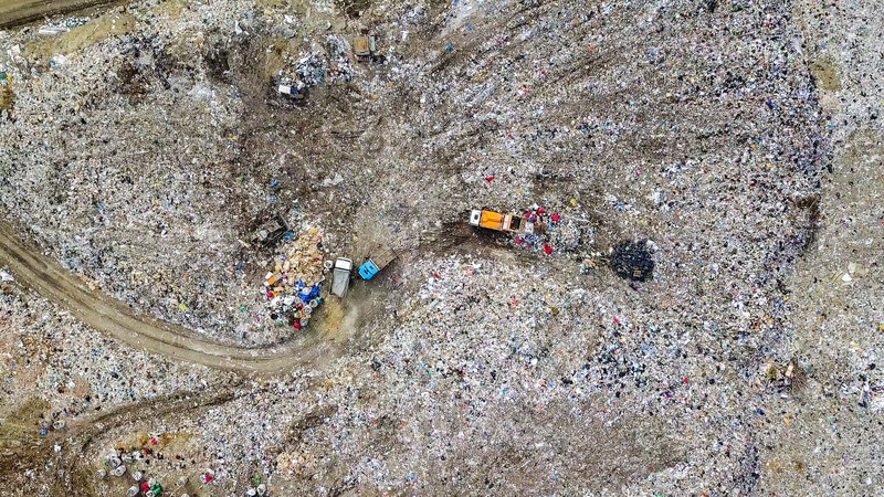 Мусоросборники выгружают мусор на свалку в окрестностях города Екатеринбург, Россия, с беспилотника, HEAD OVER SHOT