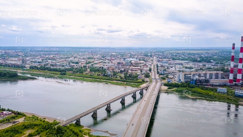 Кузнецкий мост через реку Томь. Панорамный вид на город Кемерово. Россия, Из Дрона