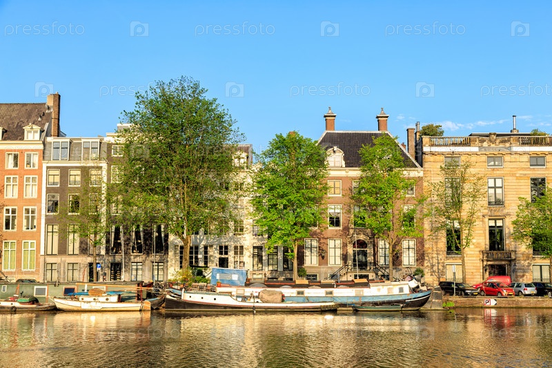Амстердам, Нидерланды. Жилые баржи и дома на воде. Канал (улица) Амстел. Исторический центр города