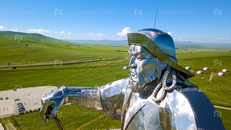 Конная статуя Чингисхана в солнечную погоду. Монголия, Улан-Батор, с дрона