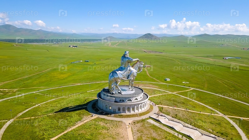 Конная статуя Чингисхана в солнечную погоду. Монголия, Улан-Батор, с дрона