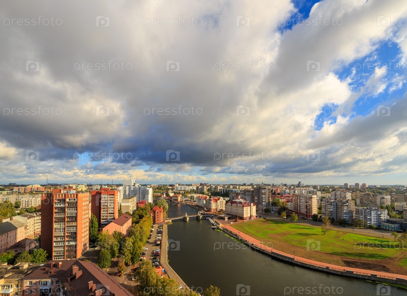Пасмурная погода в Калининграде. Река Преголя, набережная Рыбной деревни и Юбилейный мост. Россия, Калининград