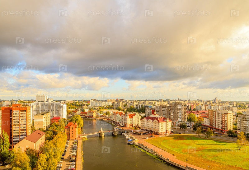 Центральная часть города Калининграда, набережная Рыбной деревни, Юбилейный мост. Калининград, Россия