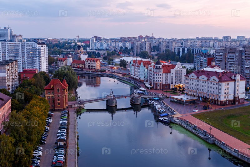 Раннее утро в Калининграде. Река Преголя, набережная Рыбной деревни и Юбилейный мост. Россия, Калининград