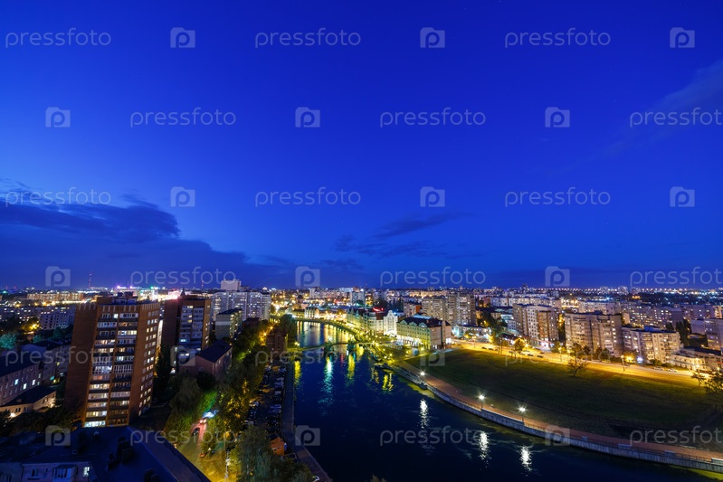 Огни вечернего Калининграда. Река Преголя, набережная Рыбной деревни и Юбилейный мост. Россия, Калининград