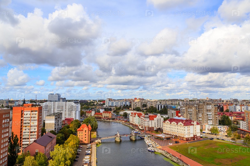 Центральная часть города Калининграда, набережная Рыбной деревни, Юбилейный мост. Калининград, Россия