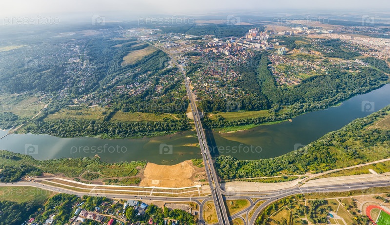 Калуга, Россия. Центральная часть. Автомобильный мост через реку Оку. С высоты птичьего полета