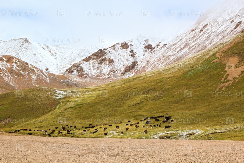 Яки пасутся в горах. Кыргызстан, Тянь-Шань;