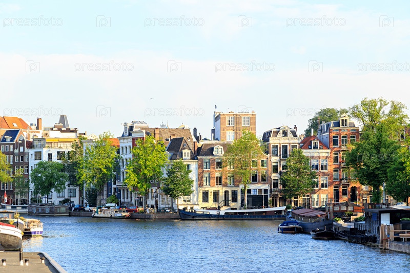 Амстердам, Нидерланды. Жилые баржи и дома на воде. Канал (улица) Амстел. Исторический центр города