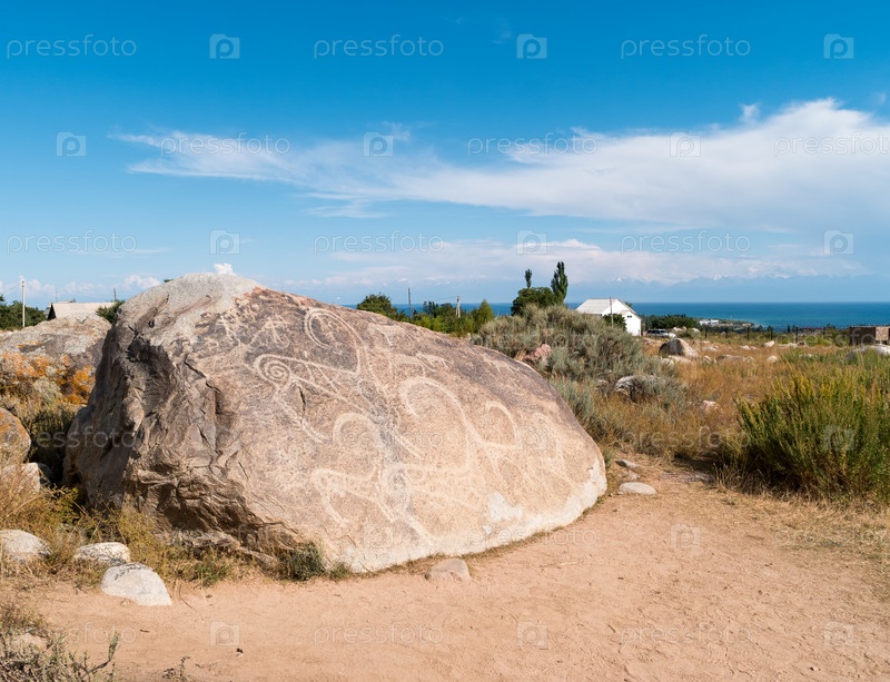 Древние рисунки, петроглифы на скалах у Иссык-Куля, Чолпон-Ата, Кыргызстан