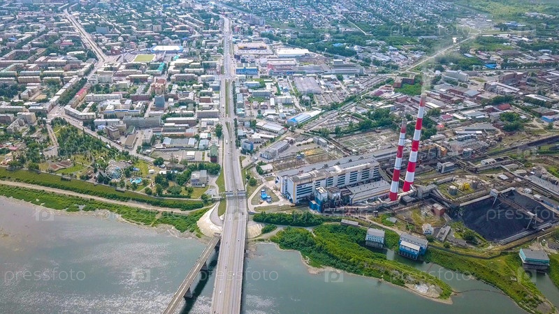 Кузнецкий мост через реку Томь. Панорамный вид на город Кемерово. Россия, Из Дрона