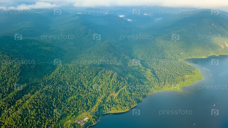 Панорамный вид на Телецкое озеро, Подъем к облакам. Россия, Алтай. Горы, покрытые лесами, От дрона