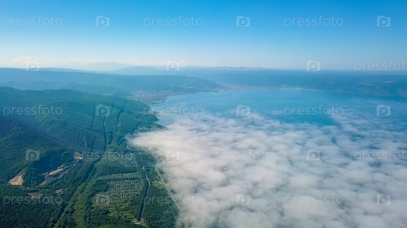 Полет над облаками. Побережье Байкала. Горы, покрытые лесом. Россия, с дрона