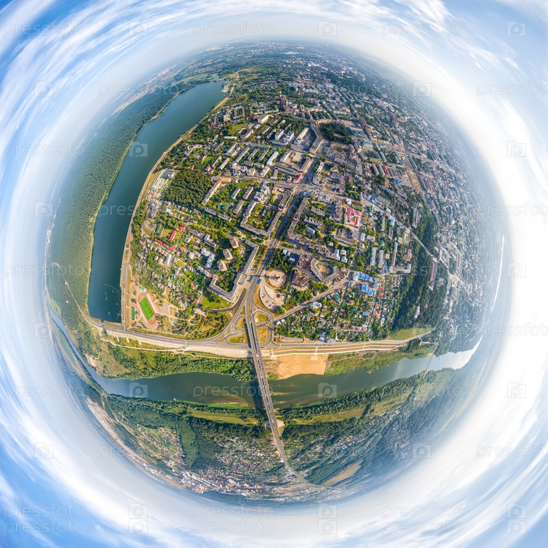 Калуга, Россия. Панорама города с воздуха. Автомобильная развязка. 360-градусный панорамный астероид