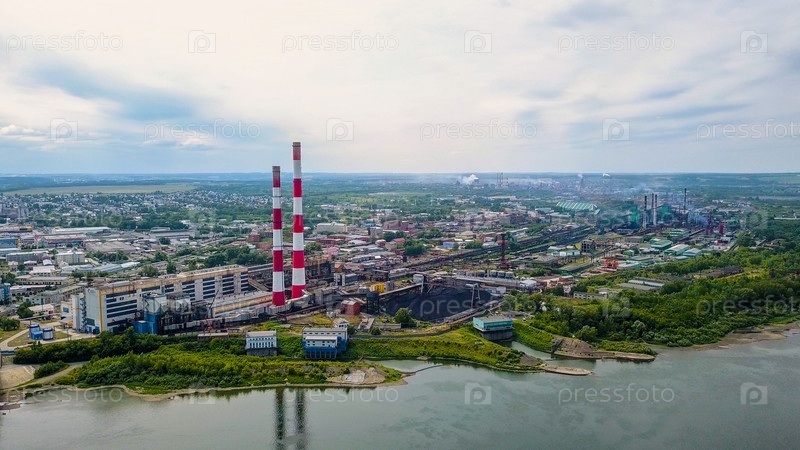 Кузнецкий мост через реку Томь. Панорамный вид на город Кемерово. Россия, Из Дрона