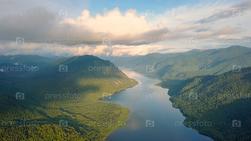 Панорамный вид на Телецкое озеро, Подъем к облакам. Россия, Алтай. Горы, покрытые лесами, От дрона