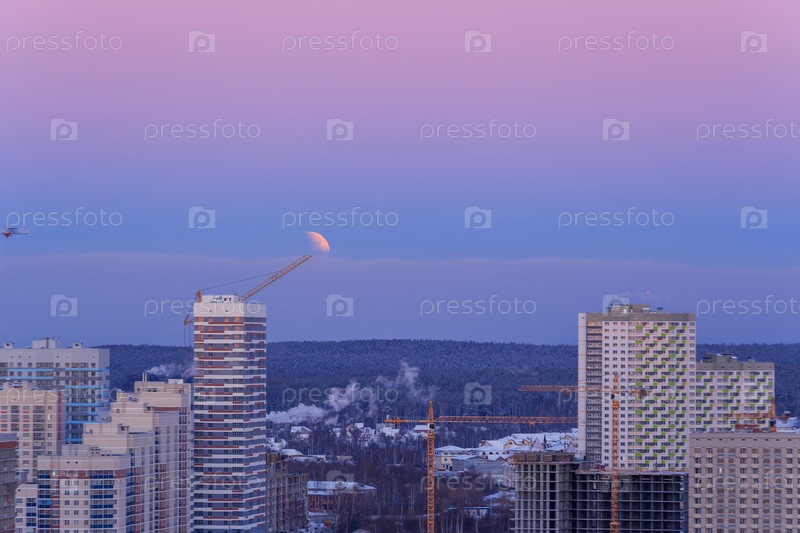 Затмение луны и закат луны. Екатеринбург, вид на новостройки и краны. 21 января 2019 г