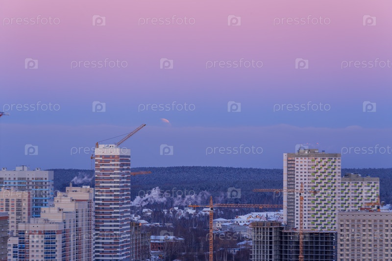 Затмение луны и закат луны. Екатеринбург, вид на новостройки и краны. 21 января 2019 г