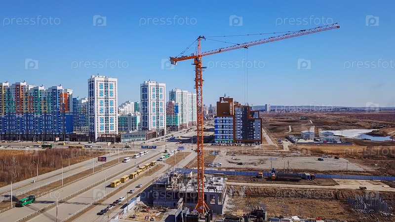 Башенный кран и здание, затем панорама на Академический район, Екатеринбург Россия