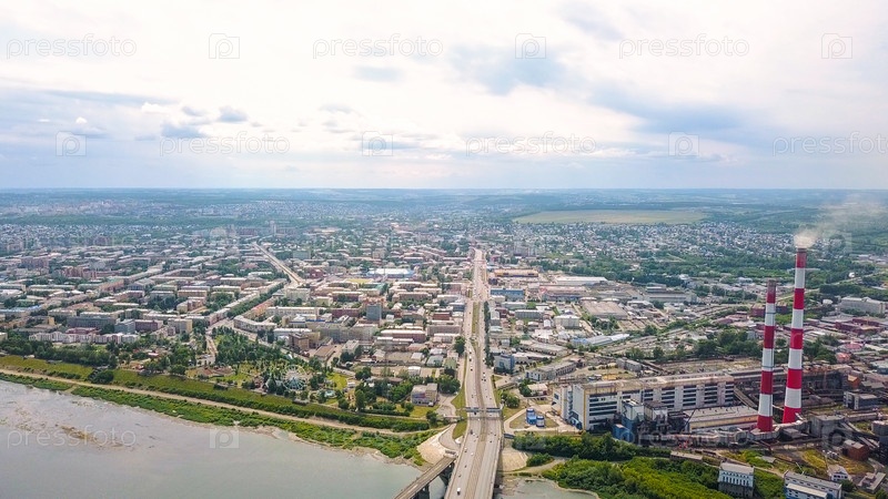 Кузнецкий мост через реку Томь. Панорамный вид на город Кемерово. Россия, Из Дрона