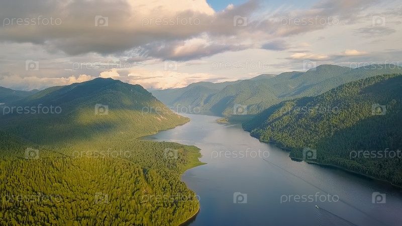 Панорамный вид на Телецкое озеро, Подъем к облакам. Россия, Алтай. Горы, покрытые лесами, От дрона