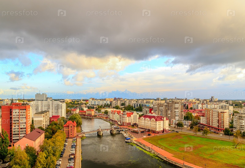 Центральная часть города Калининграда, набережная Рыбной деревни, Юбилейный мост. Калининград, Россия