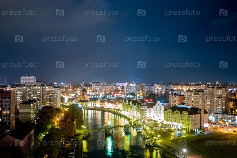 Ночь. Центральная часть города Калининграда, набережная Рыбной деревни, Юбилейный мост. Калининград, Россия