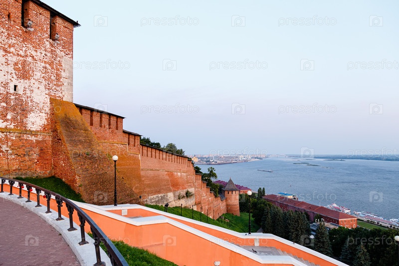 Башня и стена Нижегородского Кремля. Панорамный вид на Волгу с футбольным стадионом. Россия