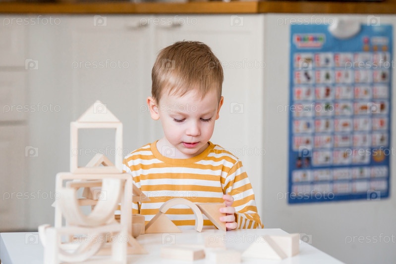 Маленький мальчик 3 лет играет в развивающий логистический конструктор. Детские деревянные игрушки. Монтессори для развития ребенка