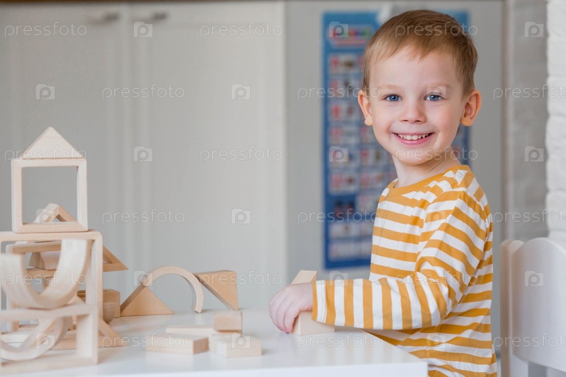 Маленький мальчик 3 лет играет в развивающий логистический конструктор. Детские деревянные игрушки. Монтессори для развития ребенка