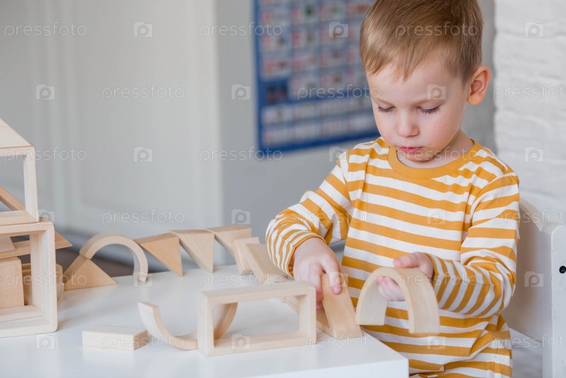 Маленький мальчик 3 лет играет в развивающий логистический конструктор. Детские деревянные игрушки. Монтессори для развития ребенка