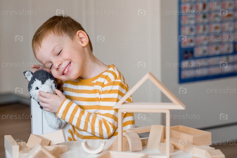 Маленький мальчик 3 лет играет в развивающий логистический конструктор. Детские деревянные игрушки. Монтессори для развития ребенка