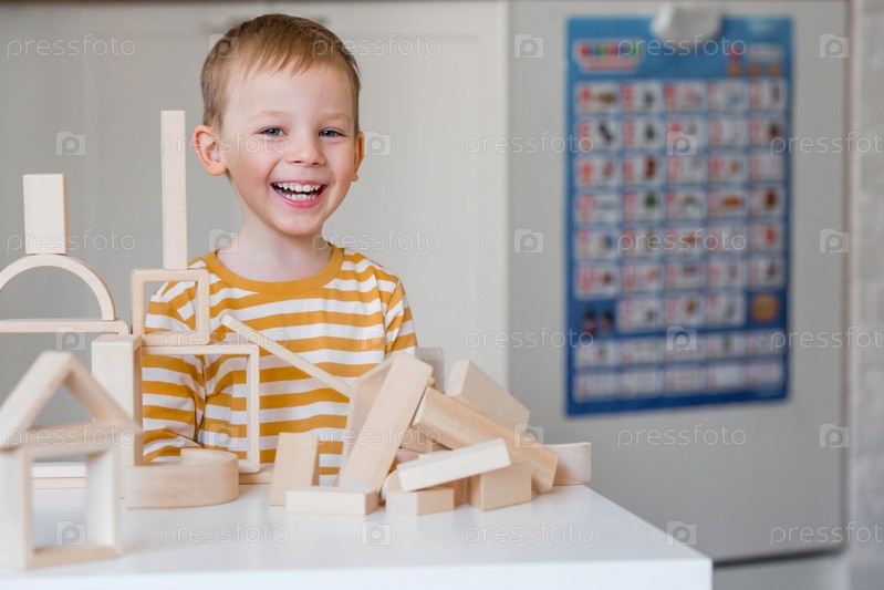 Маленький мальчик 3 лет играет в развивающий логистический конструктор. Детские деревянные игрушки. Монтессори для развития ребенка
