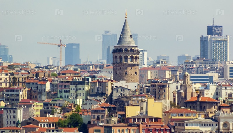 Горизонт города Стамбула в Турции, старые дома района Бейоглу с башней Галата на вершине, вид с Золотого Рога