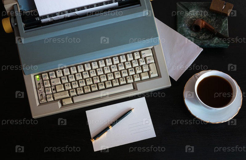 Ретро-пишущая машинка на деревянном столе. Воздушный угол обзора